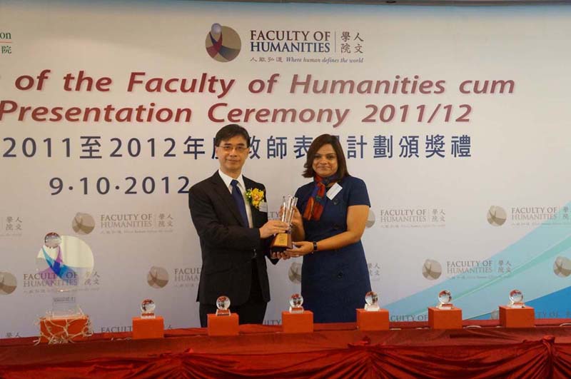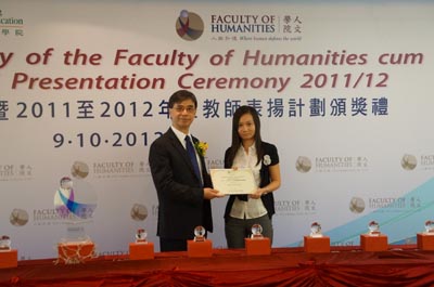同場並舉行了2011至2012年度教師表揚計劃頒獎禮,人文學院院長陳國球教授分別頒發了卓越教學獎予文學及文化學系Dr Bidisha Banerjee及表揚狀予中國語言學系鄧佩玲博士,以表揚他們傑出的教學表現,及對學院和同學的貢獻。
